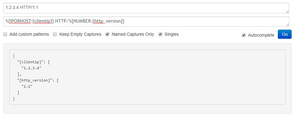 grok { match => { "message" => [ "%{IPORHOST:[clientip]} - - \[%{HTTPDATE:[timestamp]}\] \"%{WORD:[method]} %{DATA:[request]} HTTP/%{NUMBER:[http_version]}\" %{NUMBER:[response]} (?:%{NUMBER:[bytes]}|-)( \"%{DATA:[referrer]}\")( \"%{DATA:[agent]}\")" ] } }